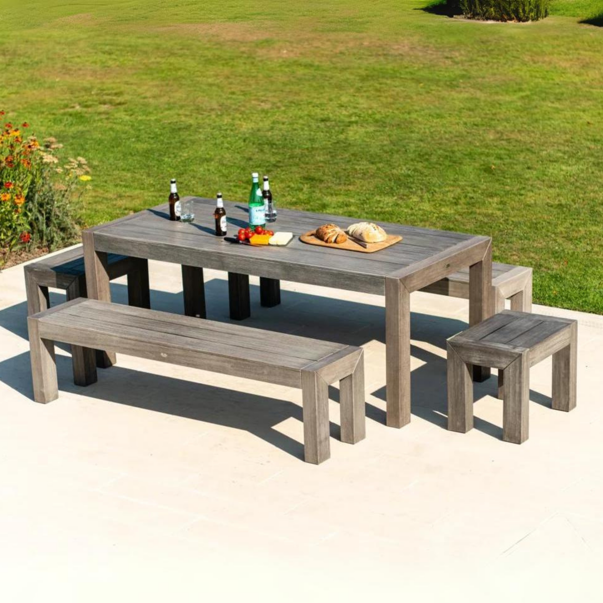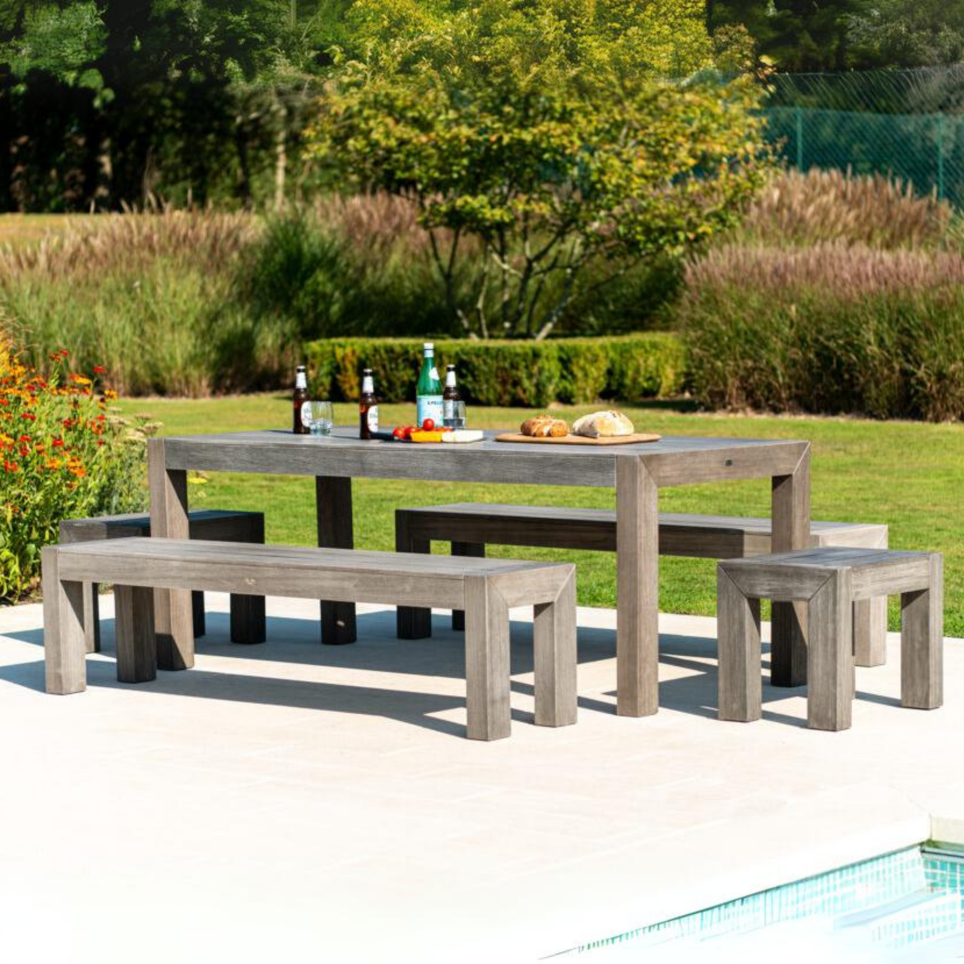 This grey painted bench is perfect for hosting large and informal family dinners. Slide two of them neatly beneath the 2m long rectangular table in our Old England range and you have yourself a striking, effortlessly chic dining table, just waiting to be the best feature in your garden or orangery. The wood the bench has been crafted from has a rustic, slightly roughened appearance, so the overall finish of products in this collection is equally classic and contemporary. You can lightly sand it down and re-apply a coat of satin paint if you want to maintain its appearance for many years to come.
