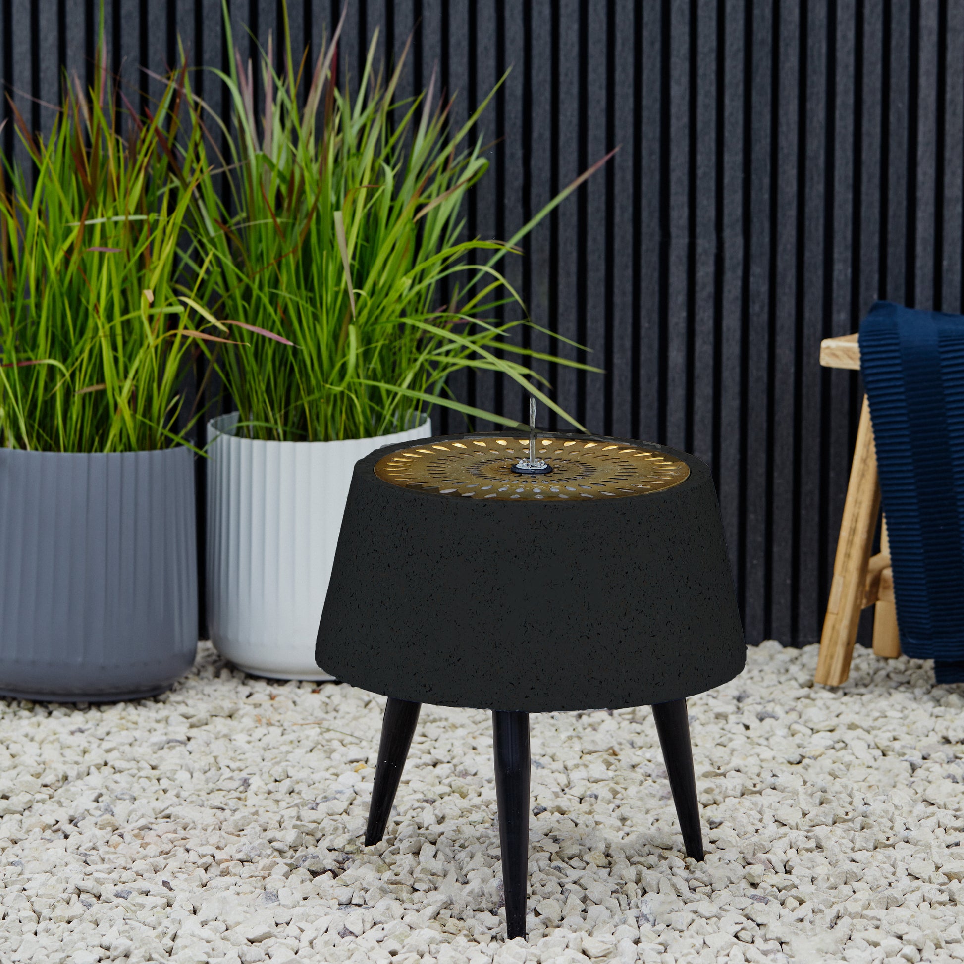 The Ivyline Solis water feature with black legs and light display in terrazzo and brass is a stand-out feature piece when it comes to garden décor. Rust-resistant, protected from sun damage and made from premium quality terrazzo and brass, the Solis metal water fountain on black legs with lights is perfectly suited to outdoor life. The black legs lift the sleek water feature off the ground, creating an elegant silhouette and adding height to your garden. The Ivyline Solis water fountain makes the ideal focal point amongst lustrous foliage!